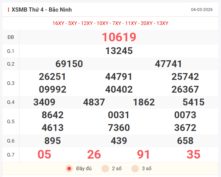 Tổng hợp kết quả xsmb hôm qua thứ 4 ngày 04/03/2026