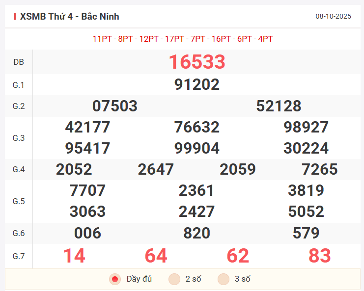 Tổng hợp kết quả xsmb hôm qua thứ 4 ngày 08/10/2025\