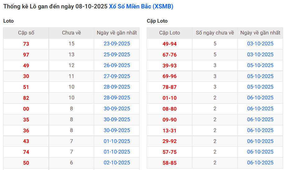⇒ Click vào để xem tổng hợp thông tin lô gan và cặp loto của xổ số miền Bắc tại: