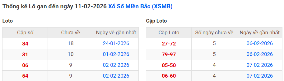 ⇒ Click vào để xem tổng hợp thông tin lô gan và cặp loto của xổ số miền Bắc tại: