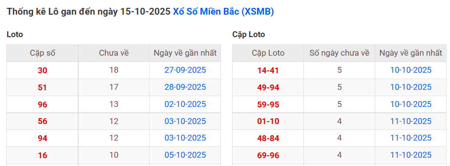 ⇒ Click vào để xem tổng hợp thông tin lô gan và cặp loto của xổ số miền Bắc tại:
