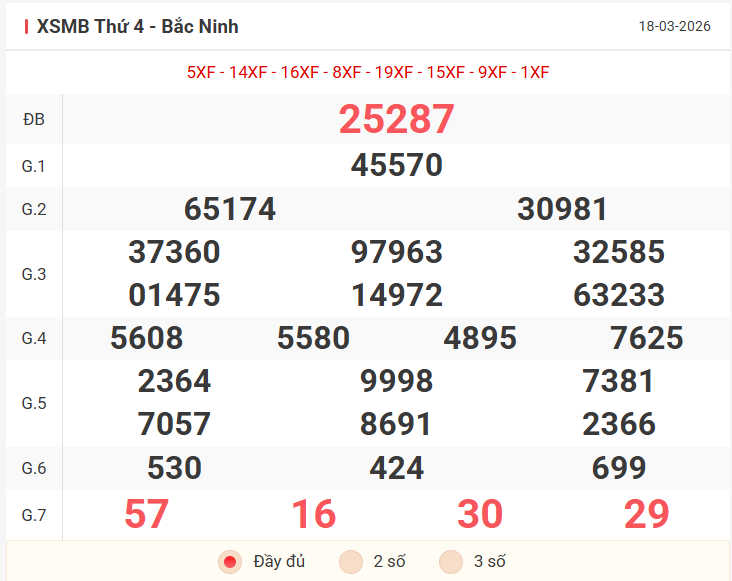 Tổng hợp kết quả xsmb hôm qua thứ 4 ngày 18/03/2026