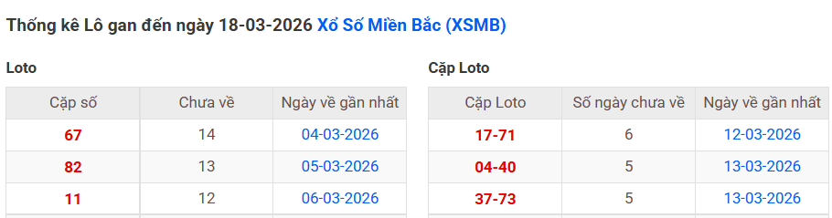 ⇒ Click vào để xem tổng hợp thông tin lô gan và cặp loto của xổ số miền Bắc tại: