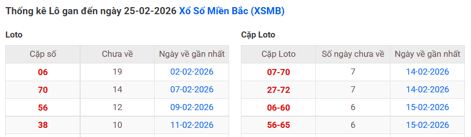 ⇒ Click vào để xem tổng hợp thông tin lô gan và cặp loto của xổ số miền Bắc tại: