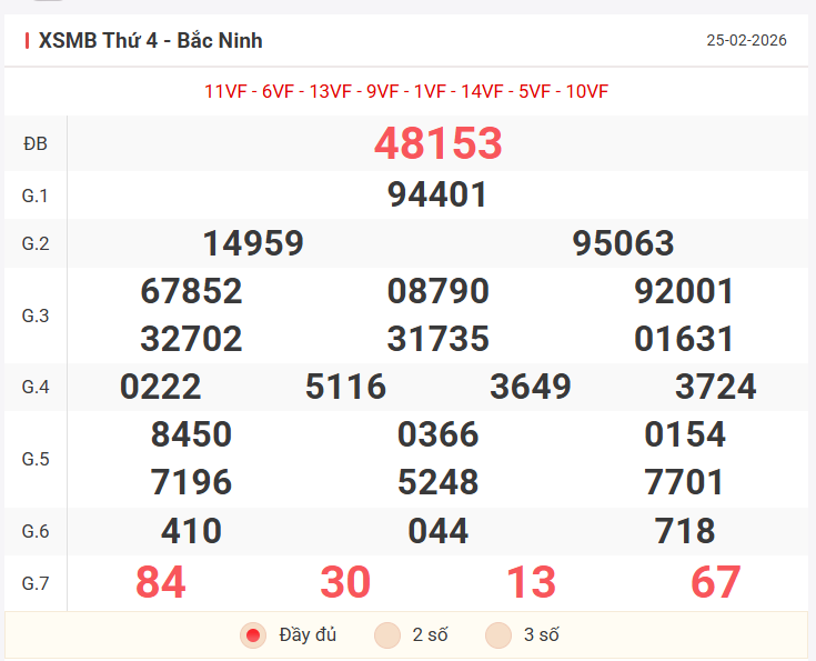 Tổng hợp kết quả xsmb hôm qua thứ 4 ngày 25/02/2026