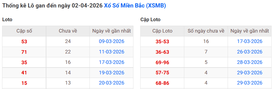 ⇒ Click vào để xem tổng hợp thông tin lô gan và cặp loto của xổ số miền Bắc tại: