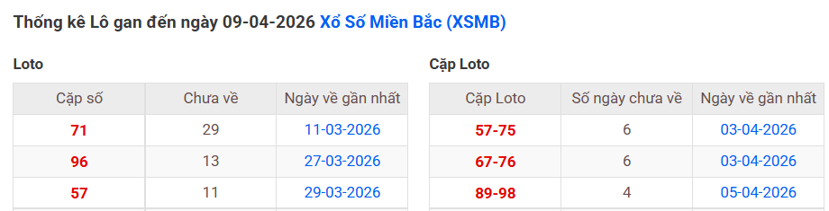 ⇒ Click vào để xem tổng hợp thông tin lô gan và cặp loto của xổ số miền Bắc tại: