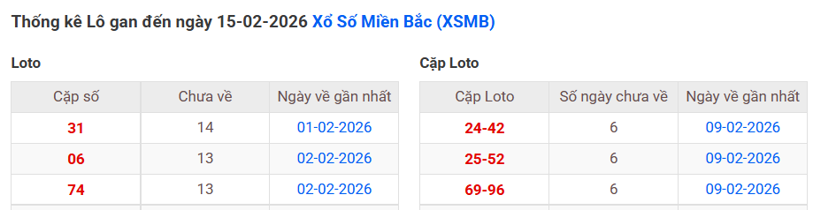 ⇒ Click vào để xem tổng hợp thông tin lô gan và cặp loto của xổ số miền Bắc tại: