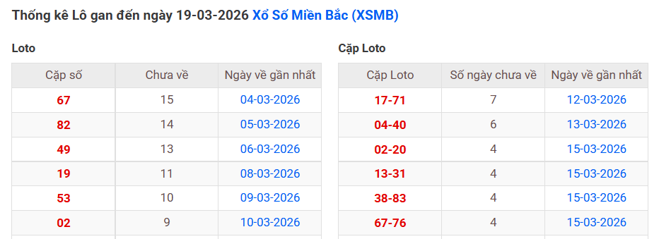⇒ Click vào để xem tổng hợp thông tin lô gan và cặp loto của xổ số miền Bắc tại:
