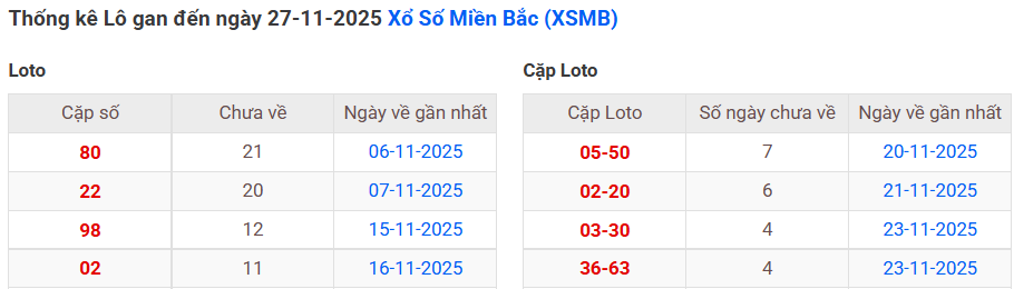 ⇒ Click vào để xem tổng hợp thông tin lô gan và cặp loto của xổ số miền Bắc tại: