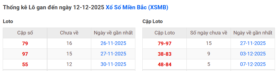 ⇒ Click vào để xem tổng hợp thông tin lô gan và cặp loto của xổ số miền Bắc tại: