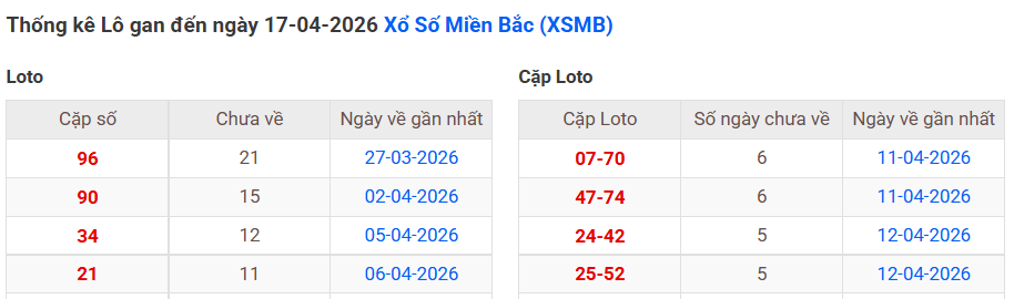 ⇒ Click vào để xem tổng hợp thông tin lô gan và cặp loto của xổ số miền Bắc tại:
