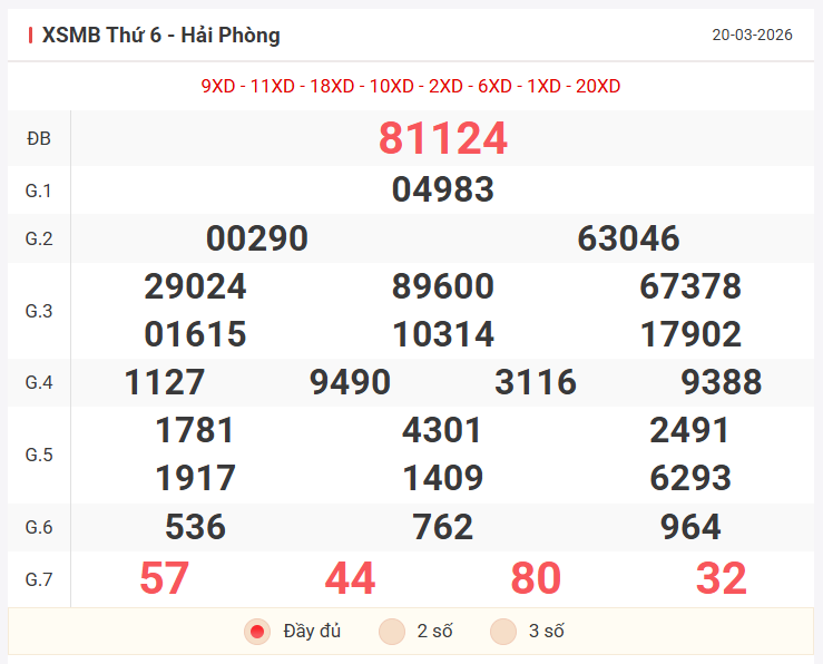 Tổng hợp kết quả xsmb hôm qua thứ 6 ngày 20/03/2026