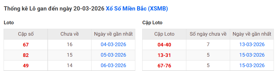 ⇒ Click vào để xem tổng hợp thông tin lô gan và cặp loto của xổ số miền Bắc tại: