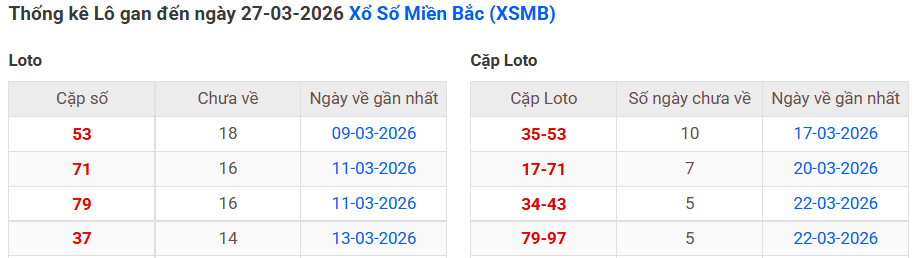 ⇒ Click vào để xem tổng hợp thông tin lô gan và cặp loto của xổ số miền Bắc tại: