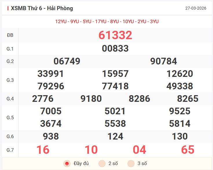 Tổng hợp kết quả xsmb hôm qua thứ 6 ngày 27/03/2026